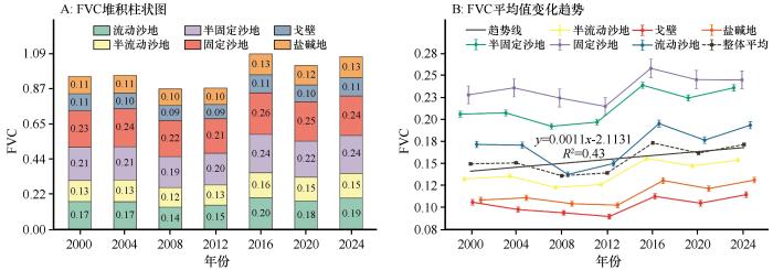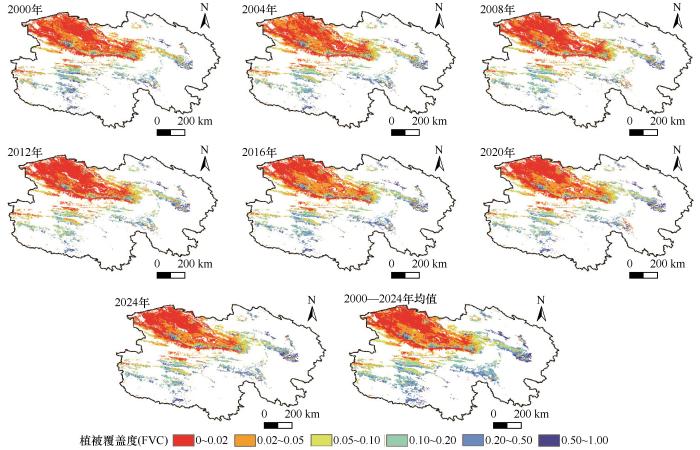 ... 式中:NDVI来源Landsat系列影像(LT05/LE07/LC08/LC09),经大气校正与云掩膜处理后,基于红波段与近红外波段计算得到[31-32];NDVIsoil与NDVIveg分别为纯裸地和纯植被像元值,通过统计区域NDVI值的累积分布,选取累计频率0.5%与99.5%所对应的NDVI值,分别作为NDVIsoil与NDVIveg[33].结合自然断点法[34]与王建华等[35]提出的沙区植被分类标准,将FVC划分为极低覆盖度(0~0.02)、低覆盖度(0.02~0.05)、中低覆盖度(0.05~0.10)、中覆盖度(0.10~0.20)、中高覆盖度(0.20~0.50)以及高覆盖度(0.50~1.0). ...
