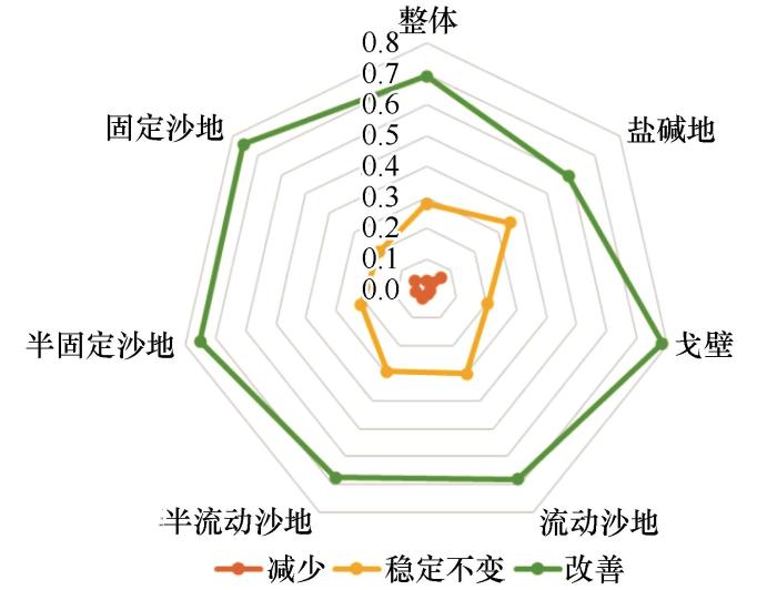 ... 固定沙地和半固定沙地作为沙区的重要生态类型,其恢复具有复杂性和挑战性.虽然大部分地区未来表现为持续性改善,但由于其处于生态恢复的脆弱临界点,受人类活动和气候变化等干扰影响较大[60],也有较高比例的区域未来呈现持续减少的趋势(固定沙地17.5%,半固定沙地11.5%).因此,这些地区的恢复策略应加强沙障建设和植被恢复工程(表5),提高土壤有机质含量与水分保持能力,优化植被结构,并减少人为活动带来的负面影响[63].尤其是半固定沙地,应在其边缘地带加强植被恢复,通过人工干预和生态工程加快恢复速度,同时根据地形特征进行土壤改良和水资源优化配置,以降低植被减少的风险[63-64].流动沙地和盐碱地由于植被稀少且处于退化序列的底端,植被未来变化波动较小[65-66],主要表现为相对稳定(分别为83.9%和79.4%).尽管这些区域在短期内没有显著变化,但长期来看,这些地区仍需更加积极的生态恢复措施,以应对未来可能出现的环境变化和人类活动的影响.在流动沙地,重点应放在加固沙障、植被恢复以及水源管理上,确保土壤稳定和水分供应[67].对于盐碱地,建议结合盐碱地改良技术(如化学修复和生物修复)降低土壤盐分,选用耐盐植物进行种植,提高土壤透水性和保水能力,进而恢复植被生长[65].对于半流动沙地,其水分流失和土壤侵蚀的风险较高,恢复策略应加强水土保持与植被恢复,尤其在较为脆弱的边缘地带;通过建设风障、增加灌溉水源、改善土壤肥力,可以有效提升植被恢复速度,并提高其抵抗风沙侵蚀的能力[66].戈壁地区因其干旱、盐碱性较强,植被恢复的难度较大,通过选择适应戈壁环境的耐旱、耐盐植物[68],结合适当的水源管理和生态保护措施,仍有一定的恢复潜力. ...