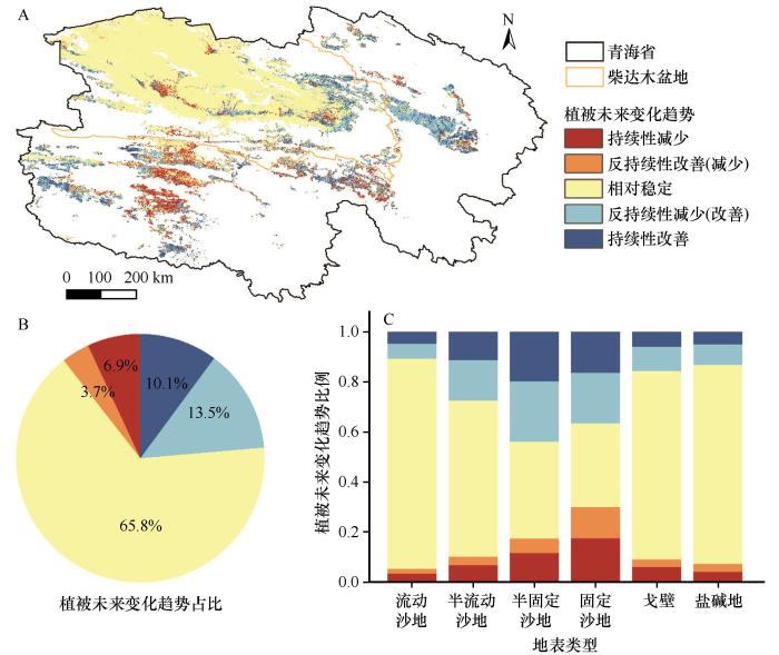 ... [63-64].流动沙地和盐碱地由于植被稀少且处于退化序列的底端,植被未来变化波动较小[65-66],主要表现为相对稳定(分别为83.9%和79.4%).尽管这些区域在短期内没有显著变化,但长期来看,这些地区仍需更加积极的生态恢复措施,以应对未来可能出现的环境变化和人类活动的影响.在流动沙地,重点应放在加固沙障、植被恢复以及水源管理上,确保土壤稳定和水分供应[67].对于盐碱地,建议结合盐碱地改良技术(如化学修复和生物修复)降低土壤盐分,选用耐盐植物进行种植,提高土壤透水性和保水能力,进而恢复植被生长[65].对于半流动沙地,其水分流失和土壤侵蚀的风险较高,恢复策略应加强水土保持与植被恢复,尤其在较为脆弱的边缘地带;通过建设风障、增加灌溉水源、改善土壤肥力,可以有效提升植被恢复速度,并提高其抵抗风沙侵蚀的能力[66].戈壁地区因其干旱、盐碱性较强,植被恢复的难度较大,通过选择适应戈壁环境的耐旱、耐盐植物[68],结合适当的水源管理和生态保护措施,仍有一定的恢复潜力. ...