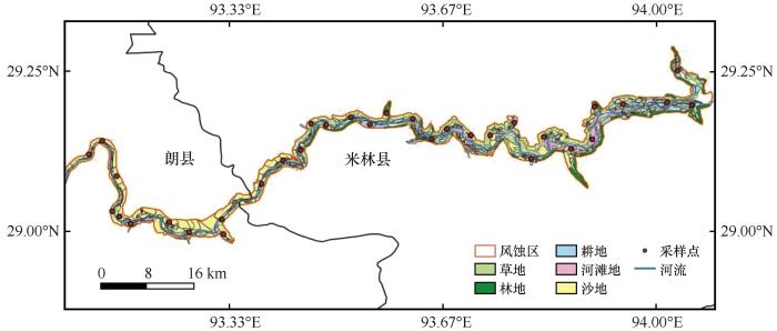 研究区位于雅江流域中下游的河谷风蚀区,地处西藏自治区东南部,自西向东横跨朗县、米林市,整体地势西部高东部低,平均海拔超3 500 m。枯水期河床裸露,水流分叉扩散,形成辫状或乱流状水系,加之大风扬沙,发育了典型的风沙地貌。该区域属于高原温带半湿润季风气候区,日照充足,年平均气温8.2 ℃,年日照时数2 000~2 500 h。干湿季分明,雨水集中,年降水量在600 mm左右,集中在5—9月,占全年总降水量的71.32%,无霜期约为170 d。