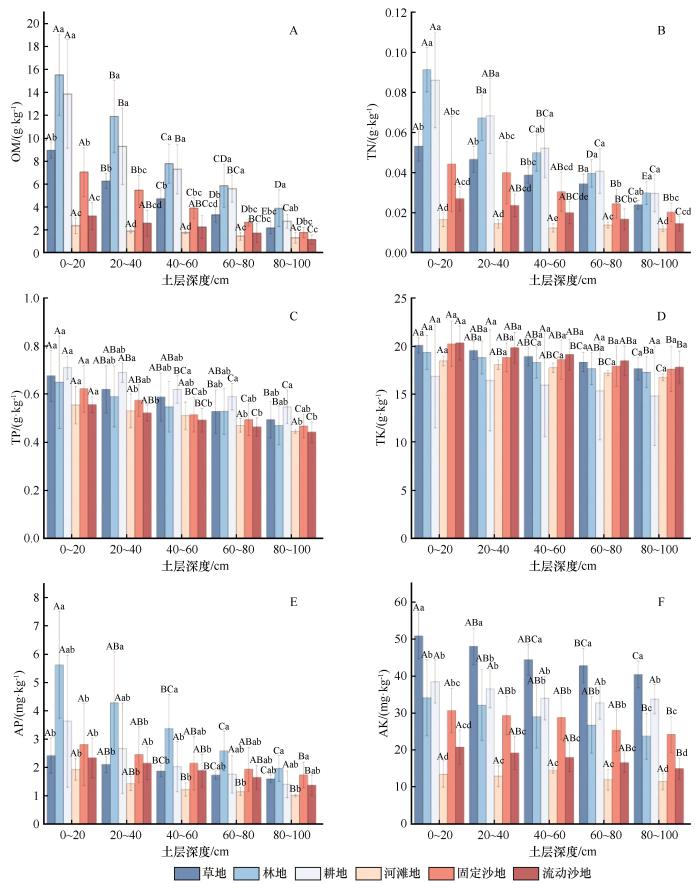 注: AK为速效钾;OM为有机质;TN为全氮;TK为全钾;TP为全磷;AP为有效磷。不同小写字母表示同一土层深度不同立地类型间差异显著(P <0.05);不同大写字母表示相同立地类型下不同土层深度间差异显著(P <0.05)