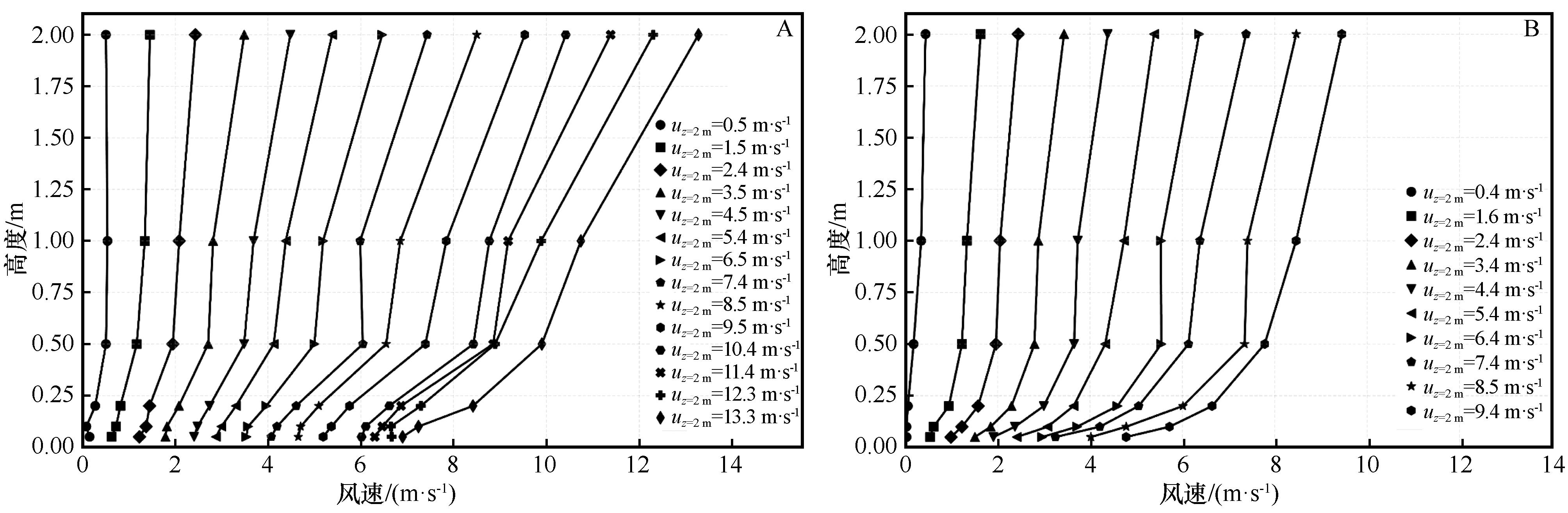 | Fig.8 Variation of wind speed profiles in different wind speed intervals for D1 (A) and D2 (B) (where uz=2 m denotes the average wind speed at 2 m height above the ground) |