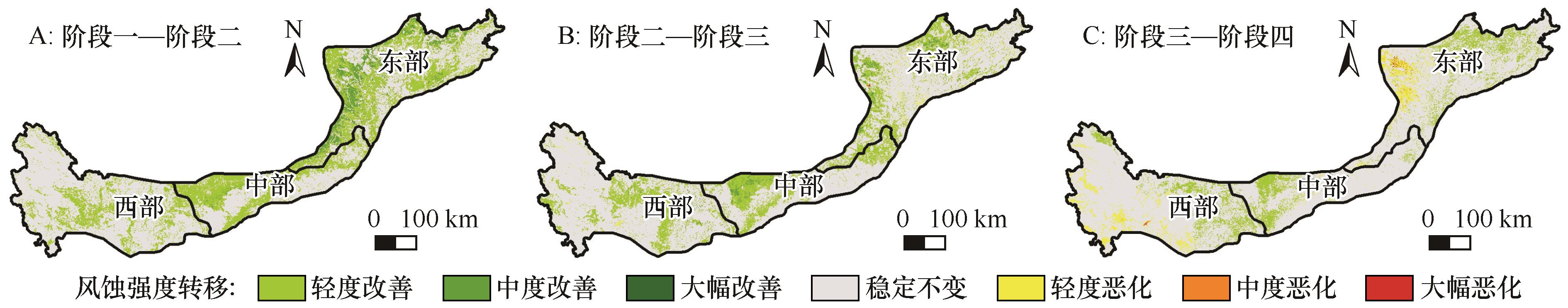 | 图4 黄土高原水蚀风蚀交错带1982—2020年土壤风蚀强度转移空间分布 |