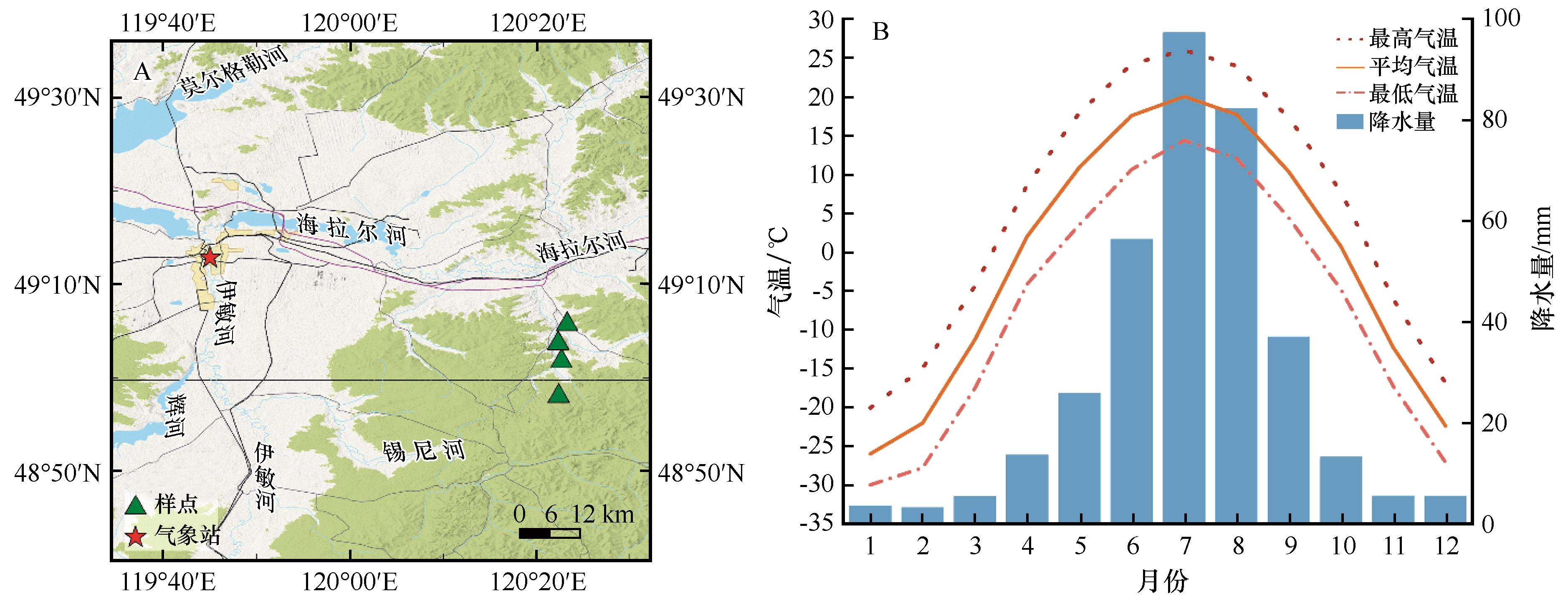 | 图1 树轮采样点及气象站分布(A)和月气象特征(B) |