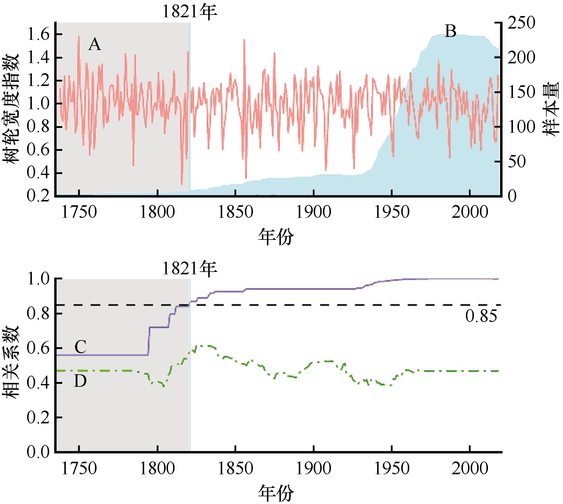 | Fig.2 Tree-ring width residual chronology (A), sample size (B), subsample signal strength (C), and running series of average correlations (Rbar, D) |