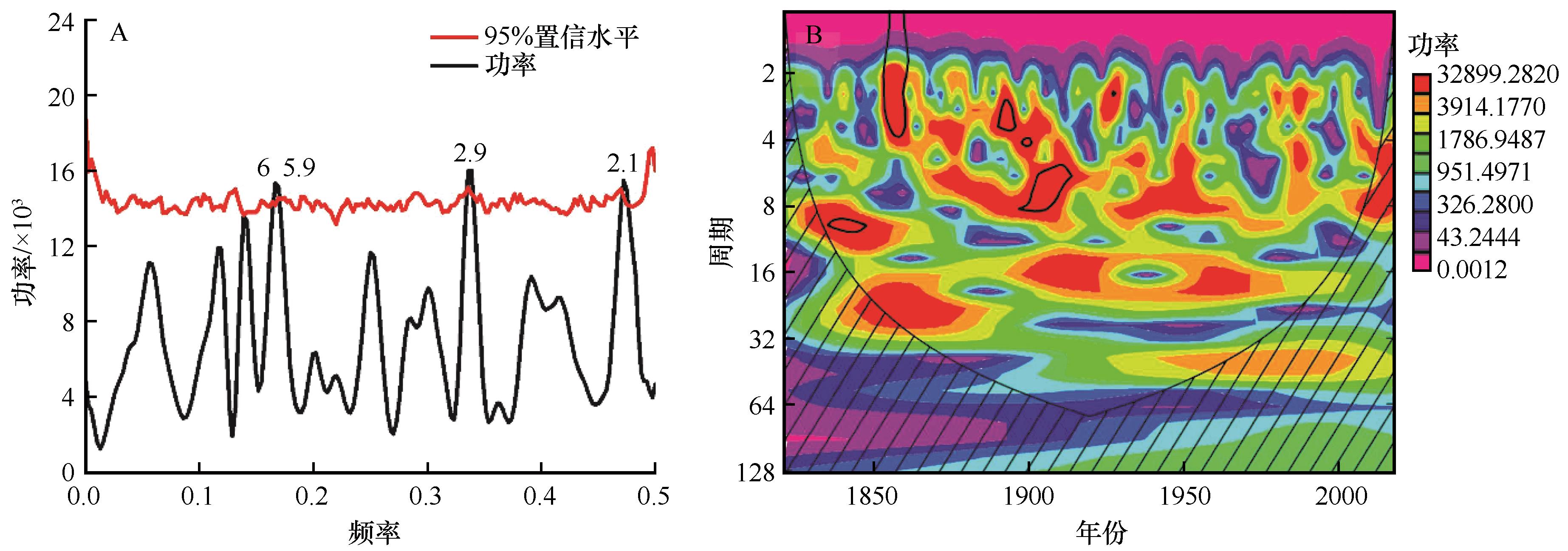 | 图7 重建降水的功率谱(A)和小波分析(B) |