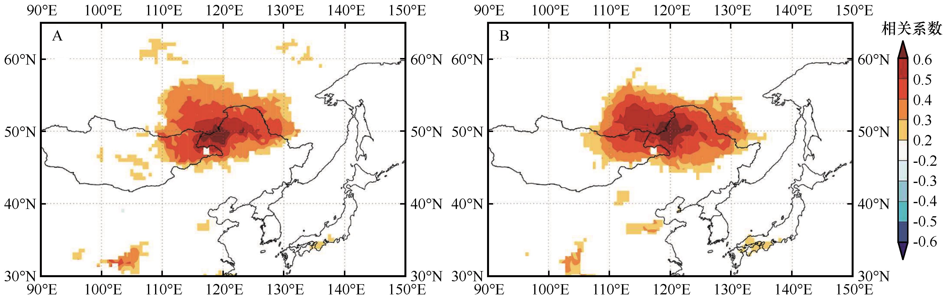 | 图8 1952—2018年观测(A)和重建(B)降水数据与CRU TS 4.08格点降水数据的空间相关性 |
