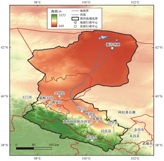 黑河流域是中国第二大内陆河流域,地处内蒙古、甘肃与青海三省(自治区)交界处。流域总面积为1.45×105 km²,海拔为669~5 573 m,祁连山是流域水源的主要产区。黑河发源于青海省祁连山北麓,经莺落峡流出后穿越河西走廊地区(包括张掖、酒泉等地),到达沙漠地区,最终消亡于内蒙古自治区额济纳旗的东、西居延海(图1 )。黑河流域气候属于典型的温带大陆性干旱气候,年降水量为104~328 mm,年蒸发量为1 639~2 341 mm,降水集中在6—9月。流域自南向北分为三段:上游祁连山地,气候寒冷湿润,地势高峻;中游河西走廊平原,气候干旱,地势平坦,是人类活动的主要区域,呈现以人工植被为主的绿洲景观;下游内陆荒漠气候极度干旱,呈现以荒漠、沙漠、戈壁为主的地貌景观。