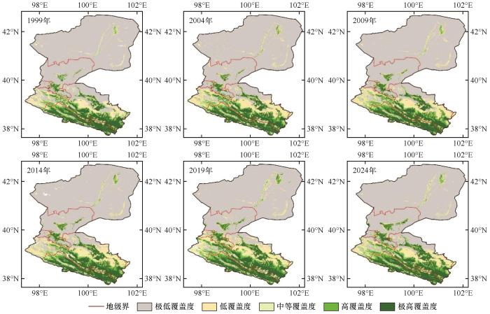 从1999—2024年植被覆盖度的空间分布可以看出,黑河流域生长季植被覆盖度总体上呈现南高北低、由南到北递减的特征。流域南部祁连山区为流域的产流区,以高、极高等级植被覆盖为主,主要类型是林地和草地;中游走廊高平原是流域人类活动的聚集区,以低、中等级植被覆盖为主,呈现以人工绿洲为主的景观;北部的额济纳旗平原降水稀少,主要景观类型为戈壁沙漠,除黑河沿岸及额济纳旗绿洲分布有极高、高等级植被覆盖,大部分地区为极低等级植被覆盖区(图2 )。整体来看,黑河流域植被覆盖度以极低覆盖度为主,其次为极高覆盖度和低覆盖度区,中等覆盖度和高覆盖度区占比很小,极低、低、中等、高、极高覆盖度植被区面积多年平均值分别为86 067.60、15 697.00、3 583.56、5 234.70、17 348.06 km2 。