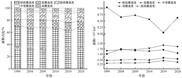 1999—2024年各等级植被覆盖度的面积占比及面积变化