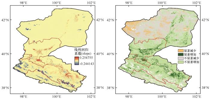 式中:θ slope 为像元回归方程的斜率;f v c i 为第i 年的植被覆盖度平均值;n 为研究时段的年数。当θ slope >0时,表示该像元植被覆盖度在研究时段内为增加趋势;当θ slope =0,表示该像元植被覆盖度在研究时段内基本不变;当θ slope <0时,表示该像元植被覆盖度在研究时段内为减少趋势。