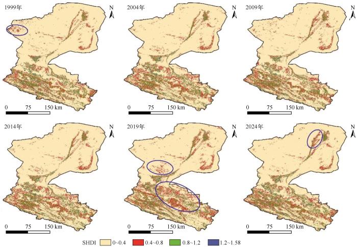Spatial distribution of SHDI values in the Heihe River Basin from 1999 to 2024