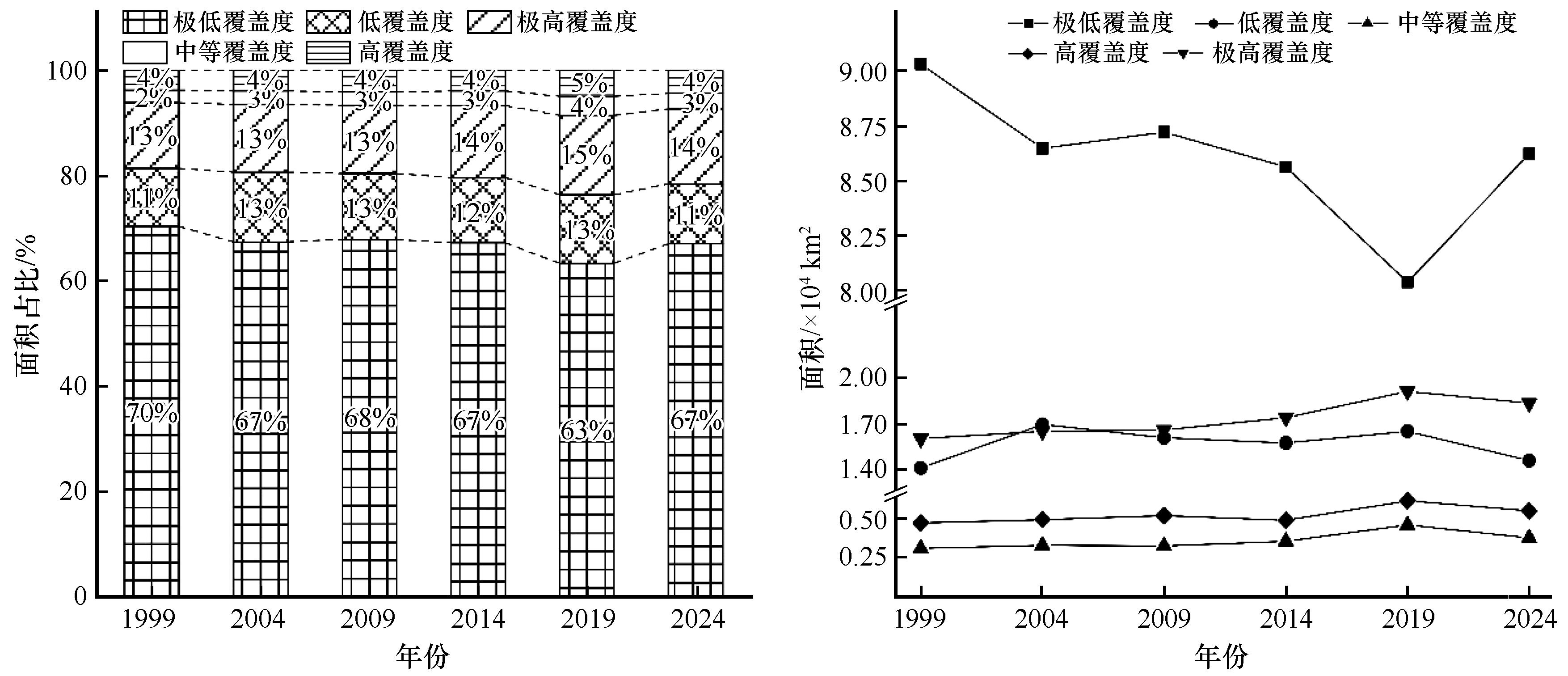 | 图3 1999—2024年各等级植被覆盖度的面积占比及面积变化 |
