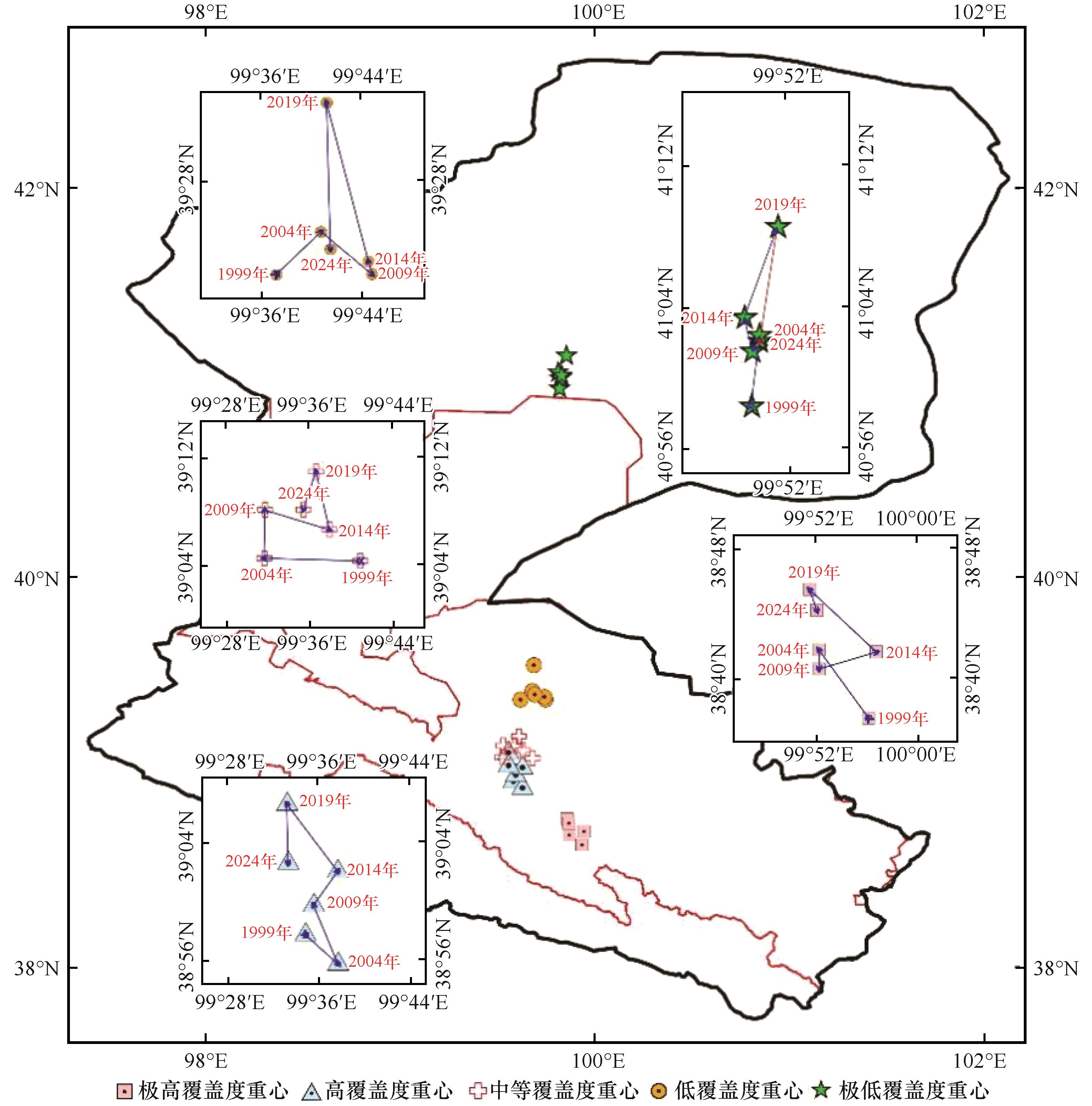 | 图5 1999—2024年黑河流域各等级覆盖度植被重心分布 |