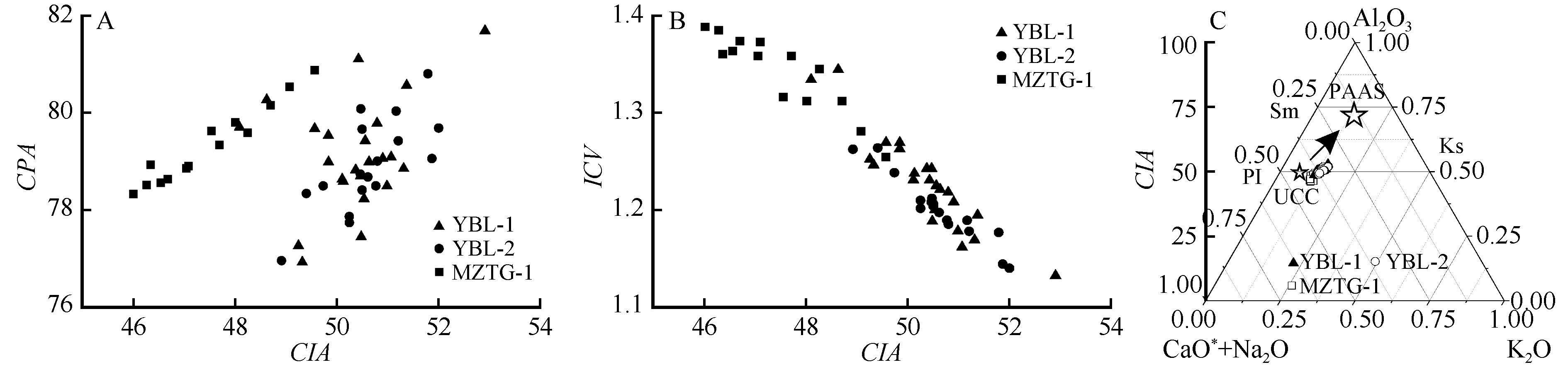 | 图5 沙丘表层沉积物化学风化参数散点图与A-CN-K三相图 |